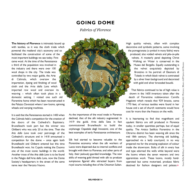The history of Florence is intimately bound up with textiles, as it was the cloth trade which powered the medieval city’s economy and so facilitated the construction of some of the most important buildings we see today. Read more…
