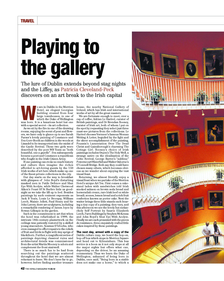 We are in Dublin in the Merrion Hotel, an elegant Georgian building created from four large townhouses, in one of which the Duke of Wellington was born. It is a luxurious hotel but one with a special secret – its art collection.